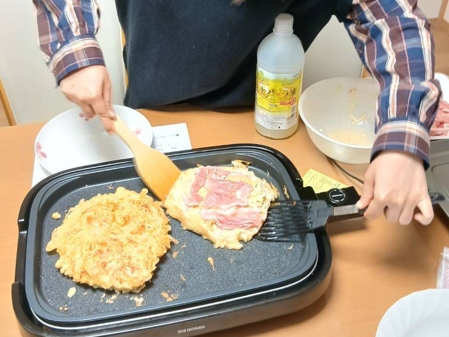 グループホームでクッキングを行い、今回はみんなで話し合って決めた「お好み焼き」を作りました。
