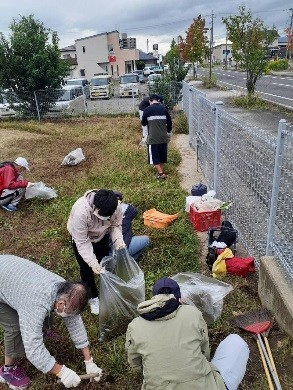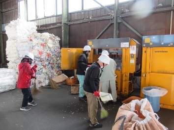 あづま授産所では、利用者の皆さんが様々な作業をしていますが、協力企業様へ出向き作業する「施設外作業」も行っています。写真の作業は野菜の加工作業、資源回収のペットボトルの圧縮作業、除草作業になります。